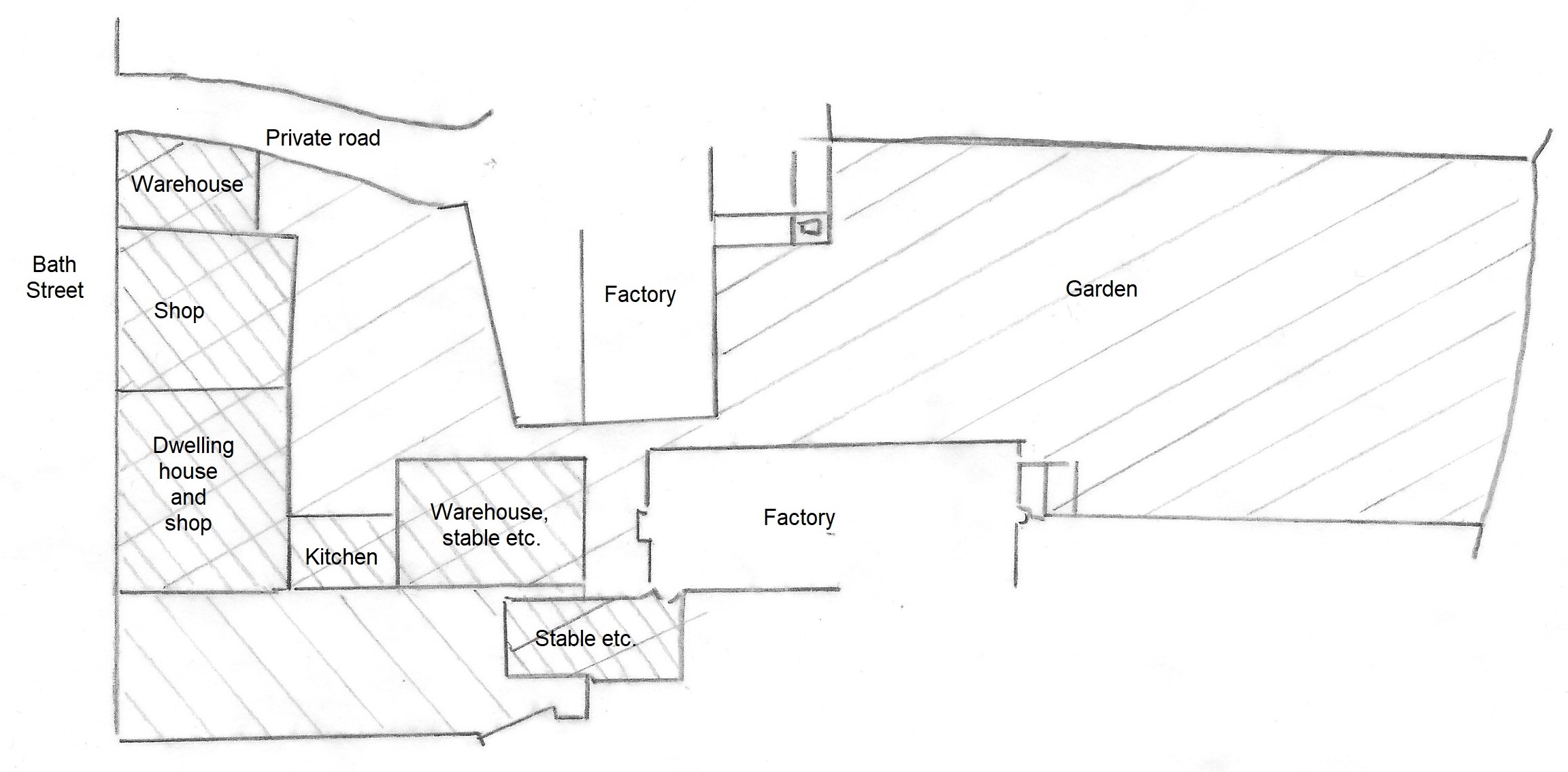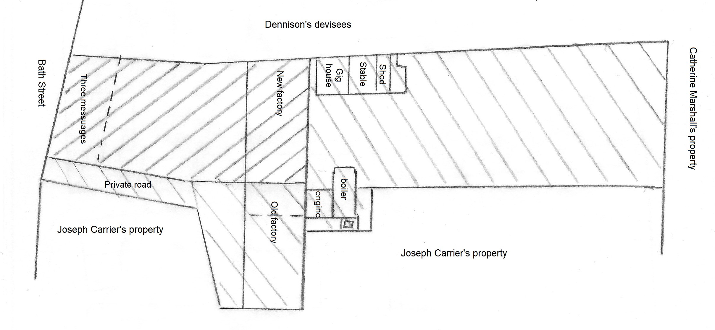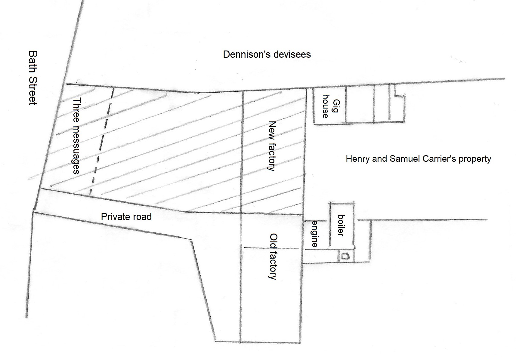 On June 9th 1860 Joseph Carrier took out a mortgage on all his Bath Street property (shaded in Plan 8 below) and four months later took out a second mortgage on other property. The hosiery warehouse, in the northwest corner, was being used by his brothers Samuel and Henry at that time.