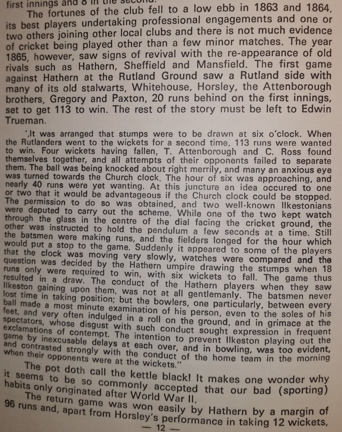 ‘In chattering o’er the fund of local cricket lore, and the contests of the Rutland with All-England and distant clubs, quoting this rare “catch” and that bold “run”, the names of Samuel and Phillip Potter, Whitehouse, William and Thomas Attenborough, Paxton, Flint, Gregory, Horsley, Trueman, Ross, and others will long be foremost in the recollections of the thousands who have proudly witnessed their exploits in the field.