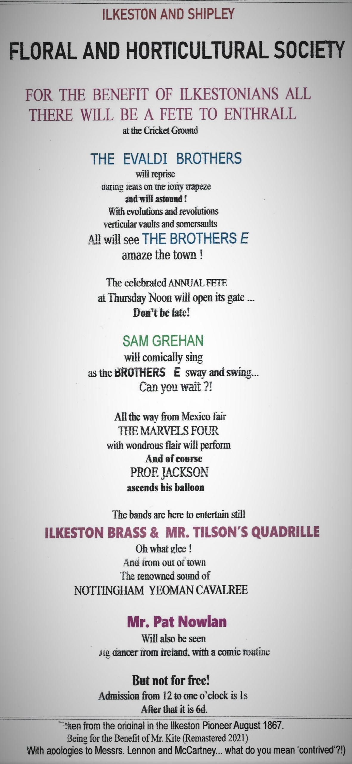 Two years later – August 1865 — and the Cricket Ground and adjacent Market Place area were again hosting the annual ‘Floral Fete’, hosted by Ilkeston and Shipley Floral and Horticultural Society.