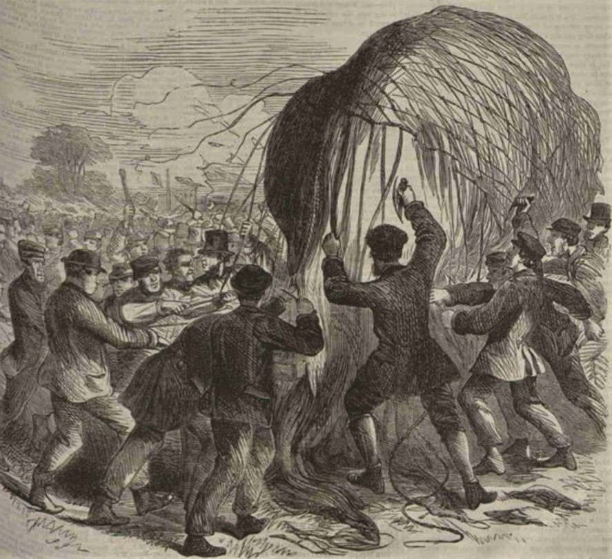 Amidst a “surging crowd of angry and excited roughs“ the Professor and balloon were dragged towards the ticket office by the attendant police, who were forced to stop frequently to repel the mob’s ringleaders. Eventually the sanctuary of the office was reached and a carriage called to transport the aeronaut to a more secure location.