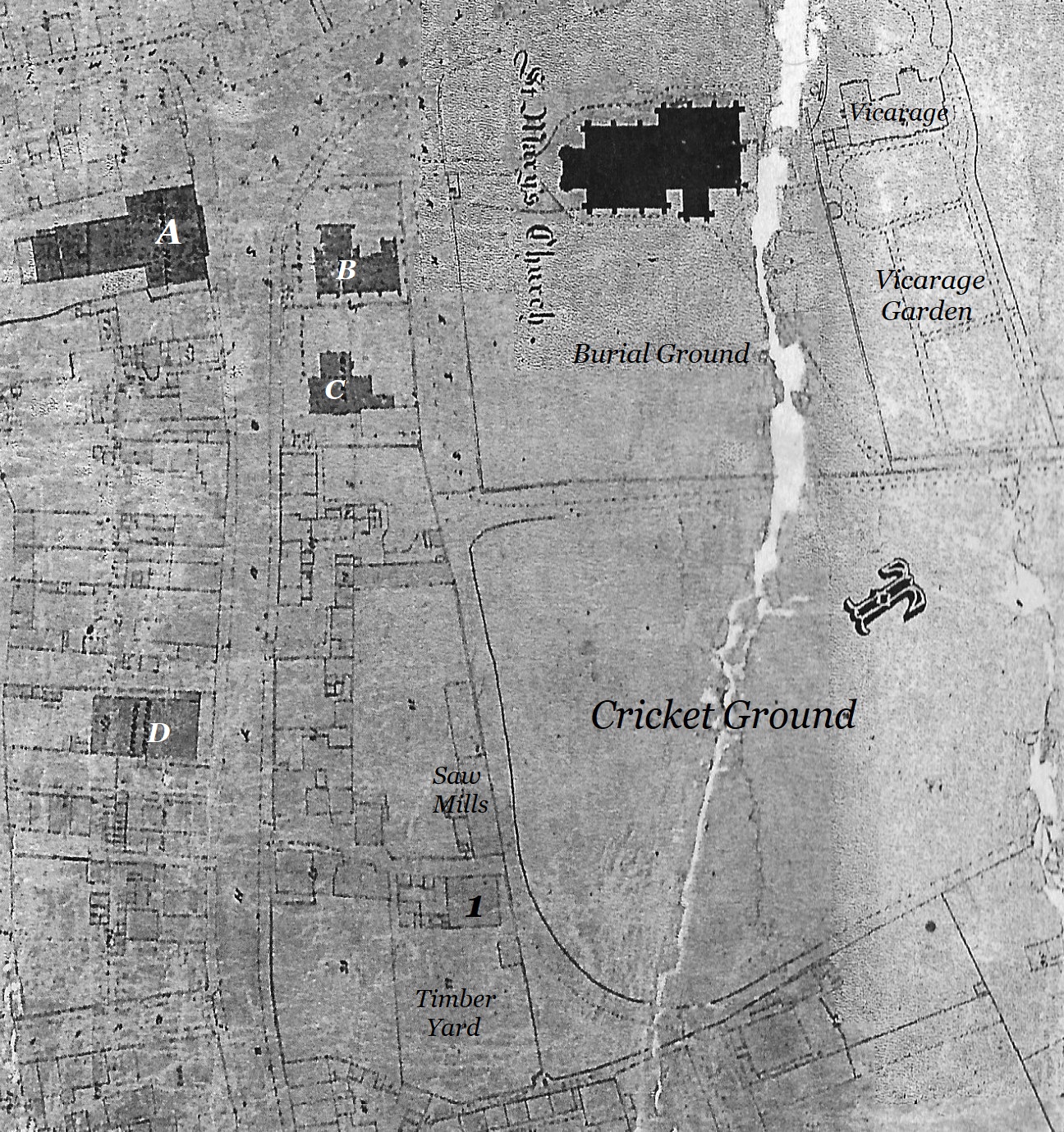 1 is the Cricket Yard Chapel : just north of it, between the Saw Mills and the Timber Yard (Warner’s Yard), is Burgin Yard. It links the Cricket Ground with South Street.