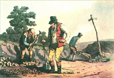 Roads were improved by paving .. that is, by laying a stratum of gravel or small broken stones on the soil. The thickness of this layer was determined by the nature of the ground, or by the availability of materials in the nearby area. It might vary from a three or four inches to a foot or more. A road made of broken stones, though firm, was not the most comfortable to travel along, nor best for the feet of horses.