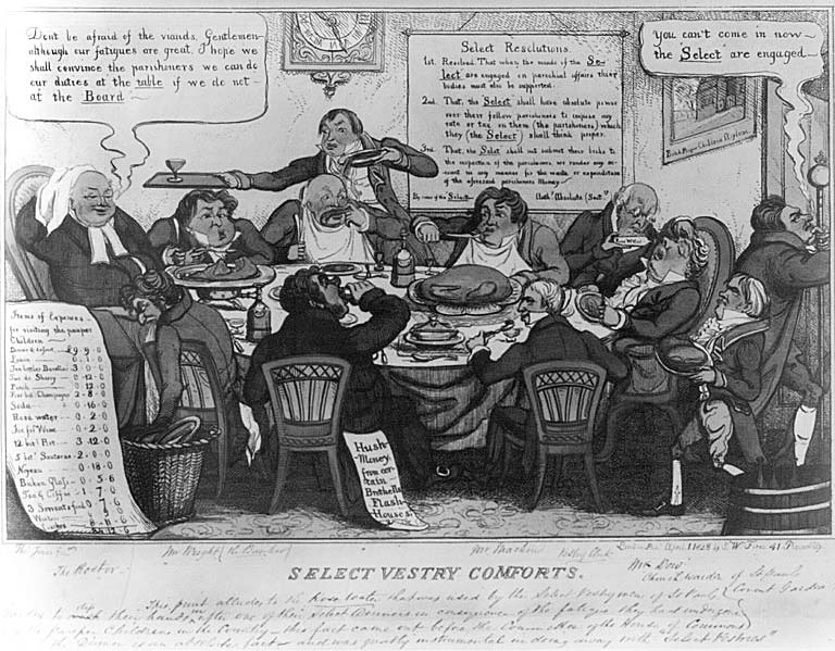 The Vestry was a group of local ‘bigwigs’, who had acquired powers mainly through custom — it became a group of the more powerful village officials, made up of important owners of property and land, and called the ‘Vestry’ because it originally met in the vestry or sacristy of the church. These people had no choice — they had to serve in their office; it was compulsory. And in return they had power within the community over its income and expenditure. The officers were the churchwardens, highway surveyors, the parish constable, overseer of the poor, and the parish clerk, sextons and scavengers.