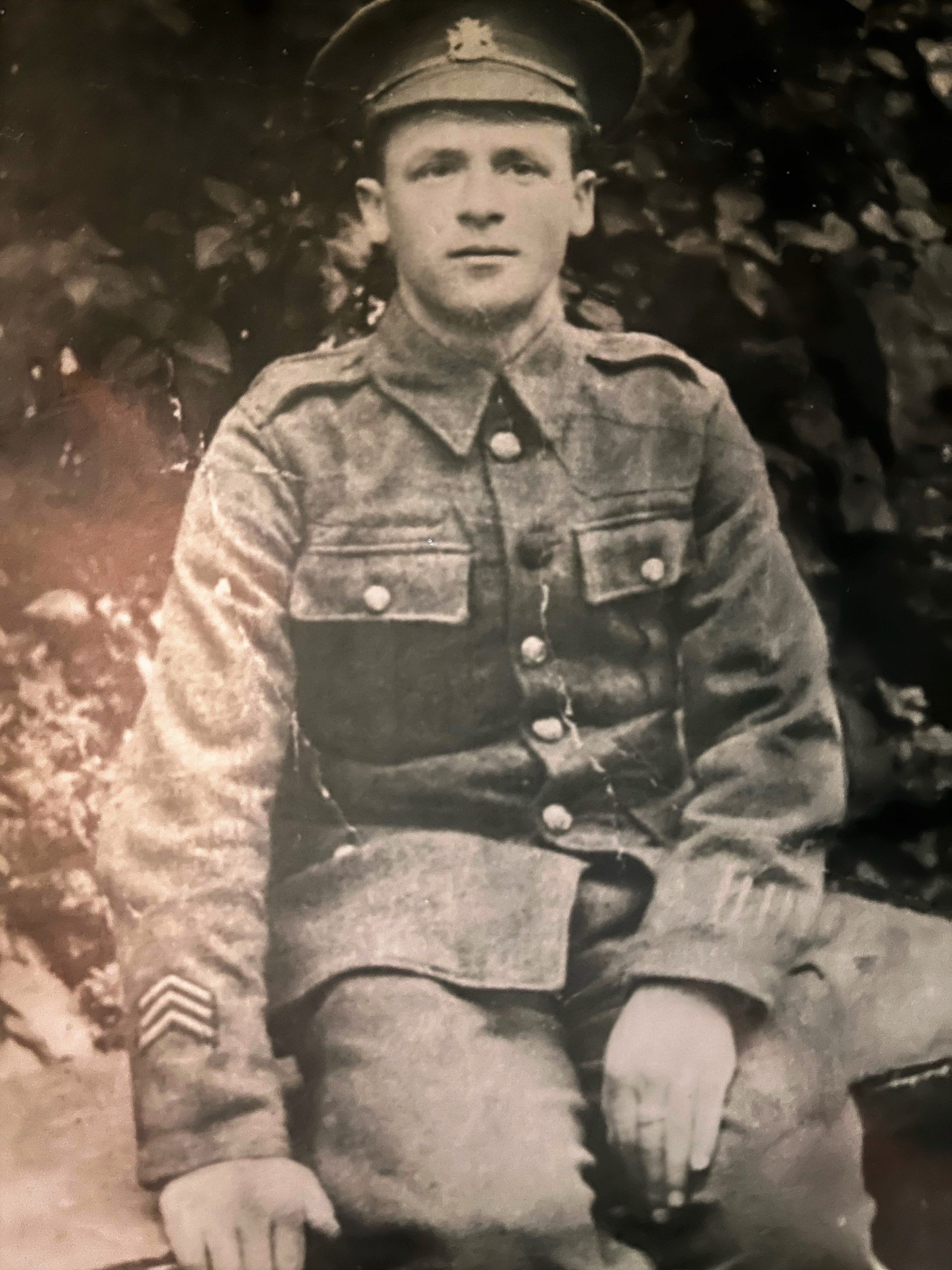 ‘Private William Howe, my uncle, a real uncle, one of “the old contemptibles”, said Kaizer Bill. Note the black button on his tunic – only allowed to wear one if lost a brother in battle – he lost his brother Arthur – died of wounds after going “over the top” with fixed bayonets’.