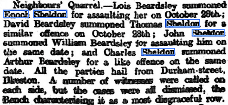 The ‘disgraceful row‘ in Durham Street included Enoch throwing a bucket of water over Lois, wife of David Beardsley, then smacking her in the eye, thereby giving her the ‘worst black eye‘ that Superintendent Daybell had ever seen !!