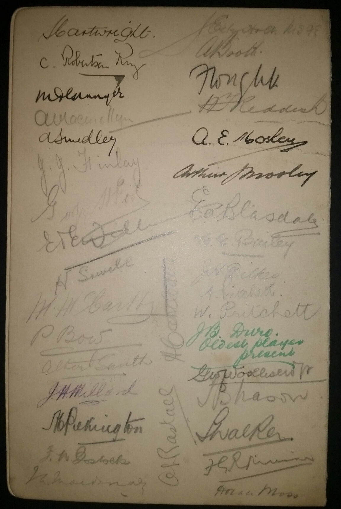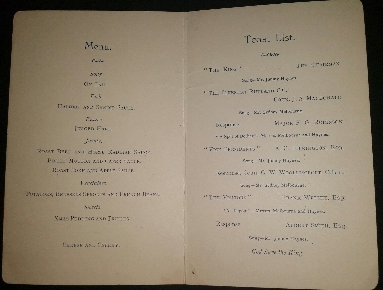 “A menu programme for a dinner held in December 1929 to celebrate the centenary of the club, signed on the back by members, the signature in the top left corner ‘S Cartwright’ being the person to whom the menu belonged. I believe Minnie lived at Woodhall Spa, Lincolnshire”.