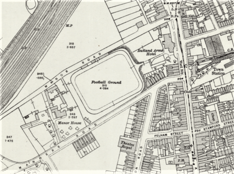 The project had started some months before but was now near to completion. “The situation of the new ground is the most convenient that could possibly have been selected, being within one minutes walk of both the Midland and Great Northern stations. Lying between the rear of the Rutland Hotel and the Manor House, the new home of sport is to be appropriately called the ‘Manor Recreation Ground’