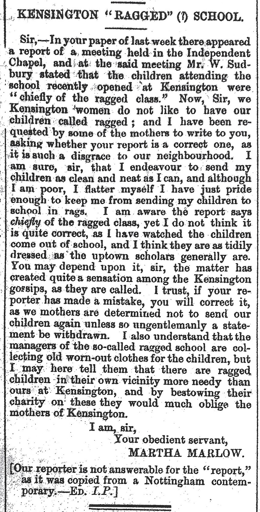 An indignant ‘Martha Marlow’ wrote to the Pioneer (Jan. 26th 1865) on behalf of herself and several other Kensington mothers, declaring that her children were clean, neat and not dressed in rags. Though poor, they did have their standards!