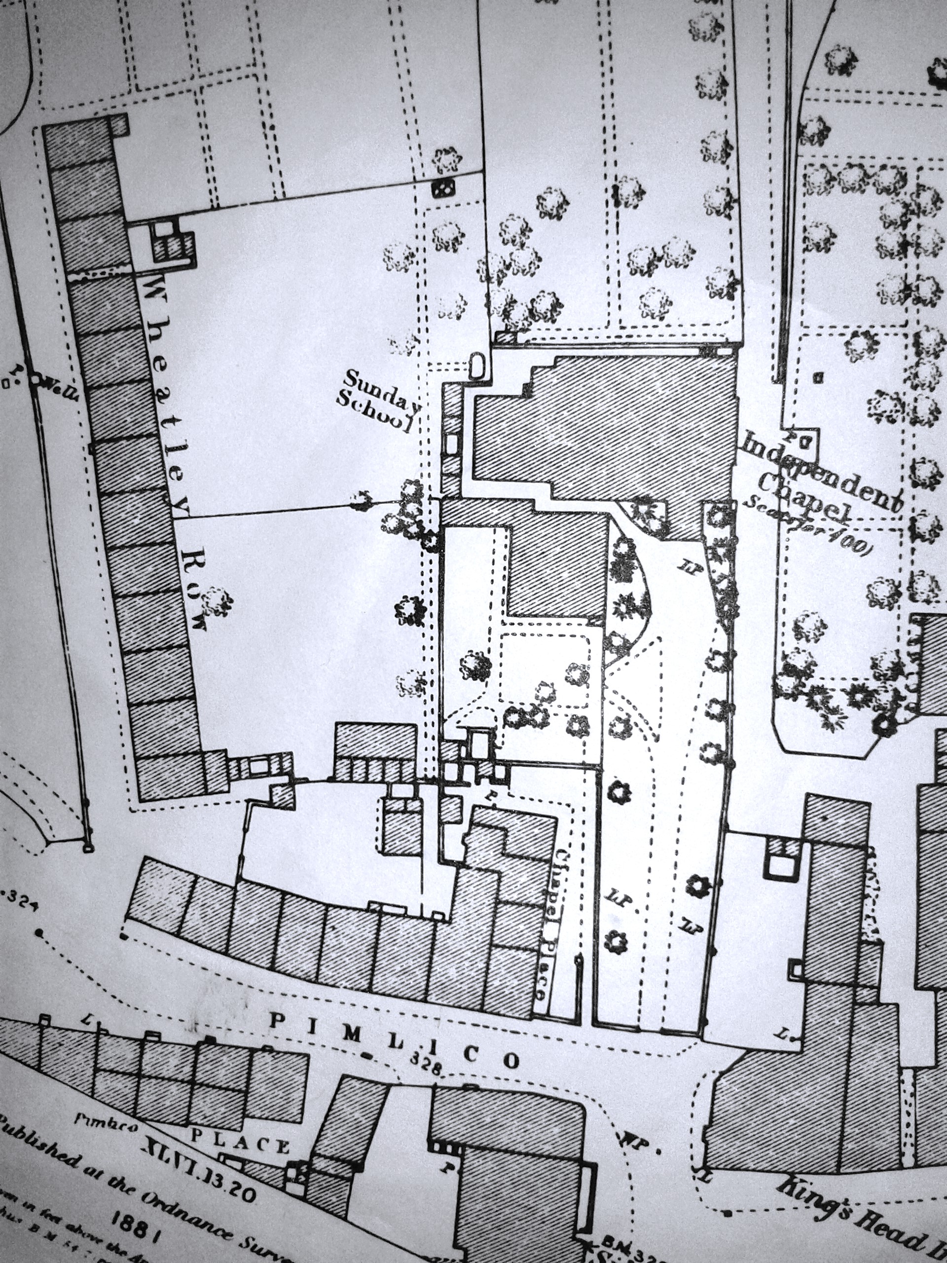 Walking around the corner from the King’s Head in the Market Place, and into Pimlico we stumble upon the Independent Chapel and the Congregational community which Adeline recalls; “the Independent Chapel at the beginning of Pimlico was a very old one, and its services were well attended.” After the Unitarian (formerly Presbyterian) Chapel in Anchor Row it was the oldest Nonconformist establishment in the town.