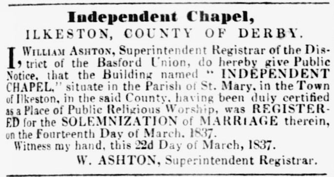 1831 …. much to the regret of his loyal congregation, Joshua Shaw left Ilkeston for Tutbury. He was followed, in September 1831, by the Rev. James Adolphus Savage who, one month later married Margaret Burrows in London. The couple left Ilkeston left about 1838. During James’s ministry a Sunday School was opened at Lewcotegate in West Hallam although, as it proved too successful for the ‘Church party’ in that parish, it was suppressed. He was followed by the Rev. Daniel Davies who was ordained on October 15th, 1839 and a month later, on November 15th, married Anne Harrison of Masbro’. He left Ilkeston in December 1844 for the Independent Chapel at Stansted, Essex, and the Ilkeston chapel was then left without a minister for almost two years before the arrival of Charles Hargreaves in October 1846.