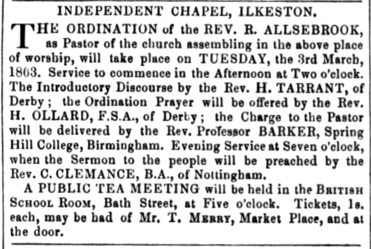 Robert Allsebrook, a student of Spring Hill College, Birmingham, began as pastor in August 1862 and was, strangely enough, publicly ordained to the ministry in Ilkeston only on March 3rd 1863 when “the congregation filled the chapel both in the afternoon and evening. The day was remarkably fine, and allowed friends to congregate from places many miles distant from”.