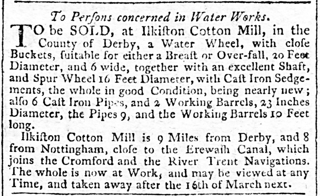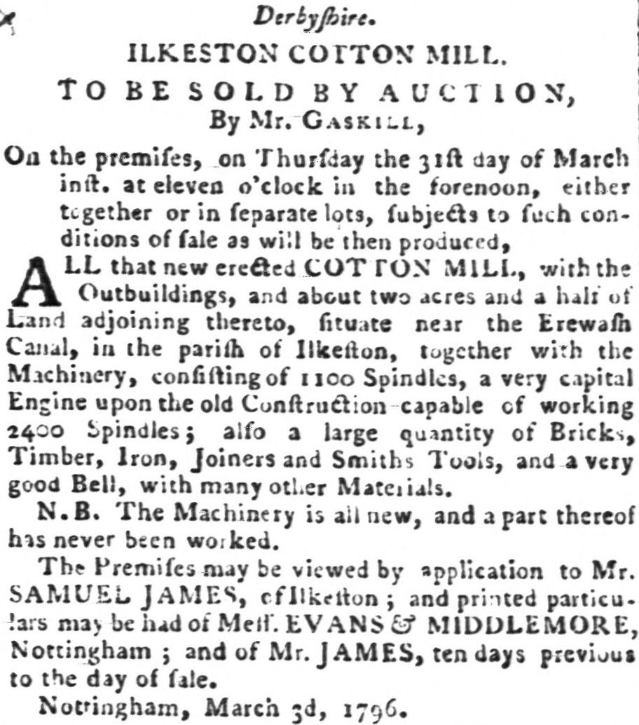 By 1802 the mill remained unsold, despite financial inducements being attached to the sale and suggestions that the building could be converted into “a capital Corn Mill” with “water carriage to any part of the Globe” via the Erewash Canal. More unsuccessful adverts were placed in the local press but someone’s patience was running thin. Eventually the following “warning” was posted in the Derby Mercury …