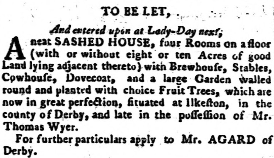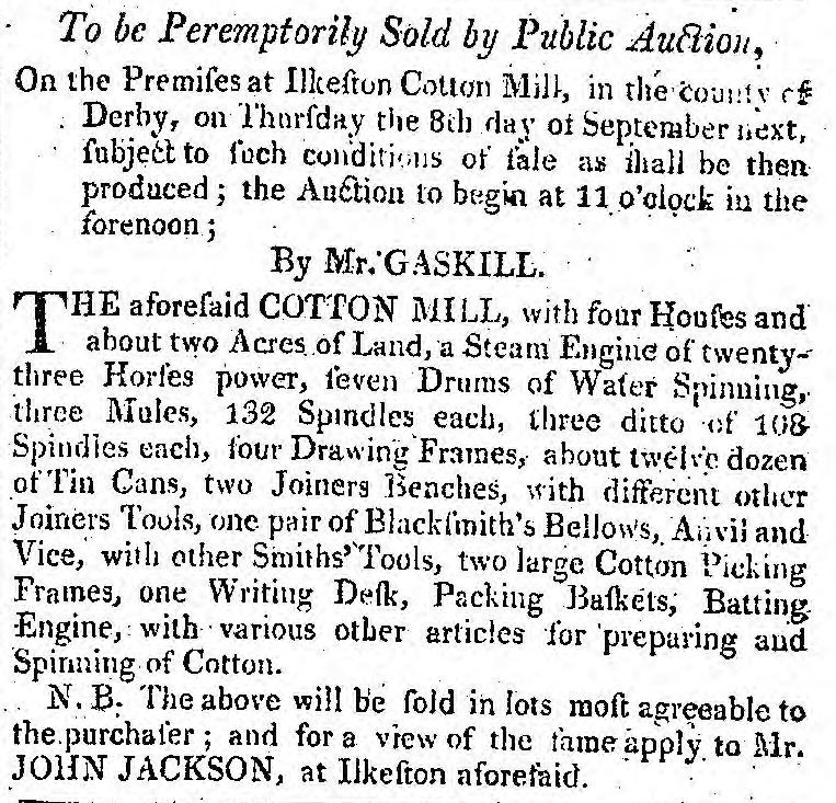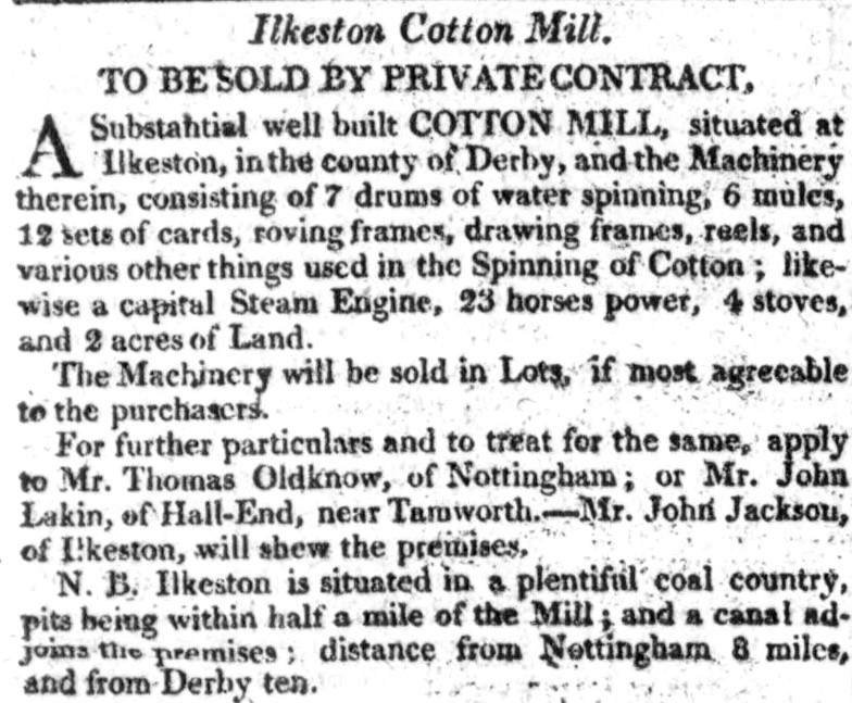 Notice how the source of power within the mill had changed and how there was now an emphasis on the availability of coal in the neighbourhood, with the canal now more as a convenient means of transport than a source of power ? Notice too the appearance of John Jackson to escort prospective purchasers around the property — did he live close by ? was he managing the mill ? He almost certainly was living at Ilkeston at the time, possibly in one of the few houses attached on the site of the mill (see the adverts below)