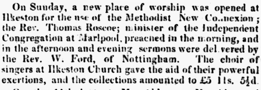 The Nottingham and Newark Mercury does mention a new Ilkeston Chapel opened in 1830 by the Methodist New Connection, but it is difficult to establish where it was or how long it survived.