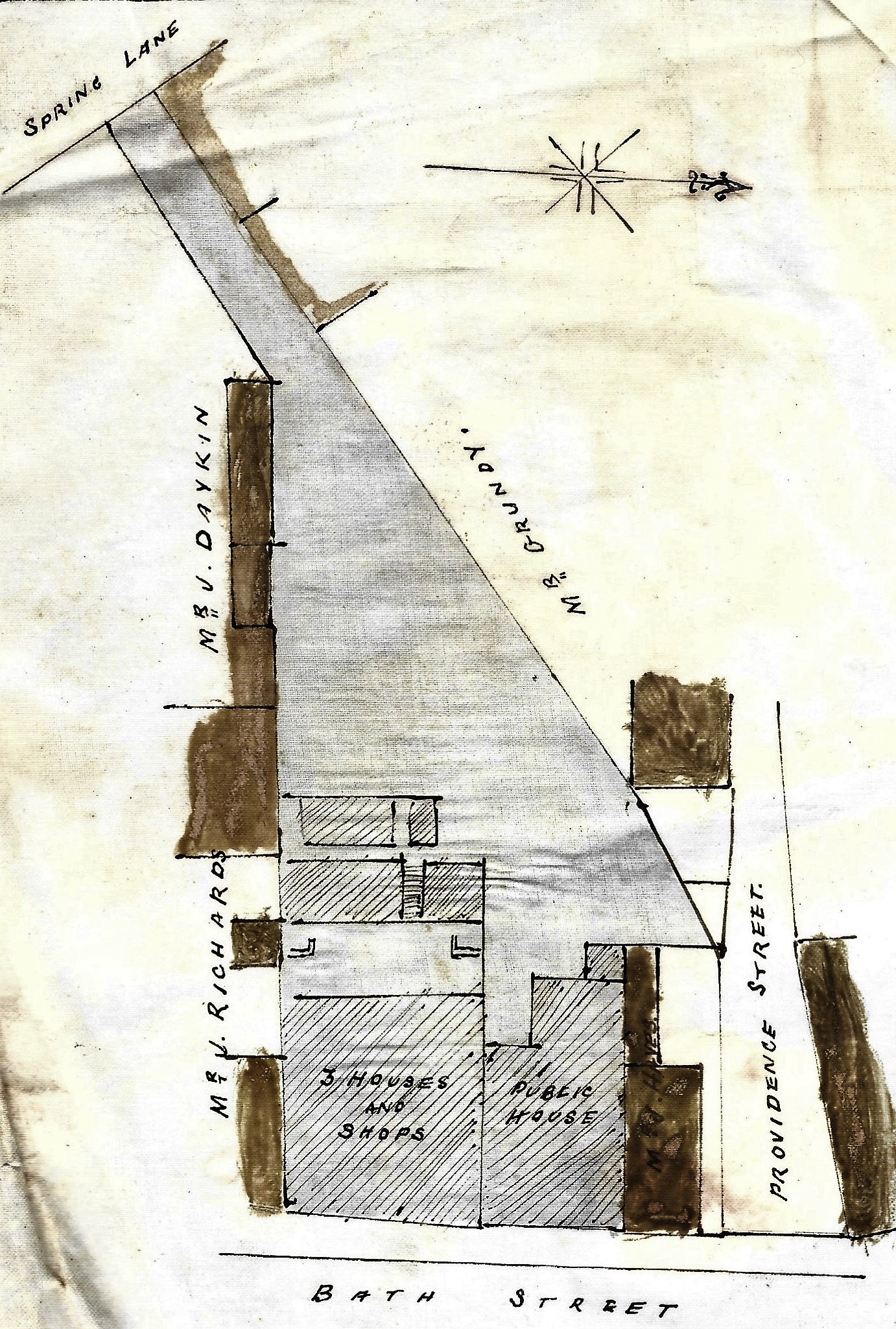 It was then described as having an area of 1000 square yards or thereabouts … notice that it was a little smaller than when John Ball first bought it, because he had sold a small piece to tailor Joshua Bates, who had later passed it on to boot dealer Joseph Hayes — you can see it as a brown area on the plan, between the ‘Public House’ and Providence Place. Notice too, that at this time the New Inn public house did not stand at the corner of Providence Place, as it does today.