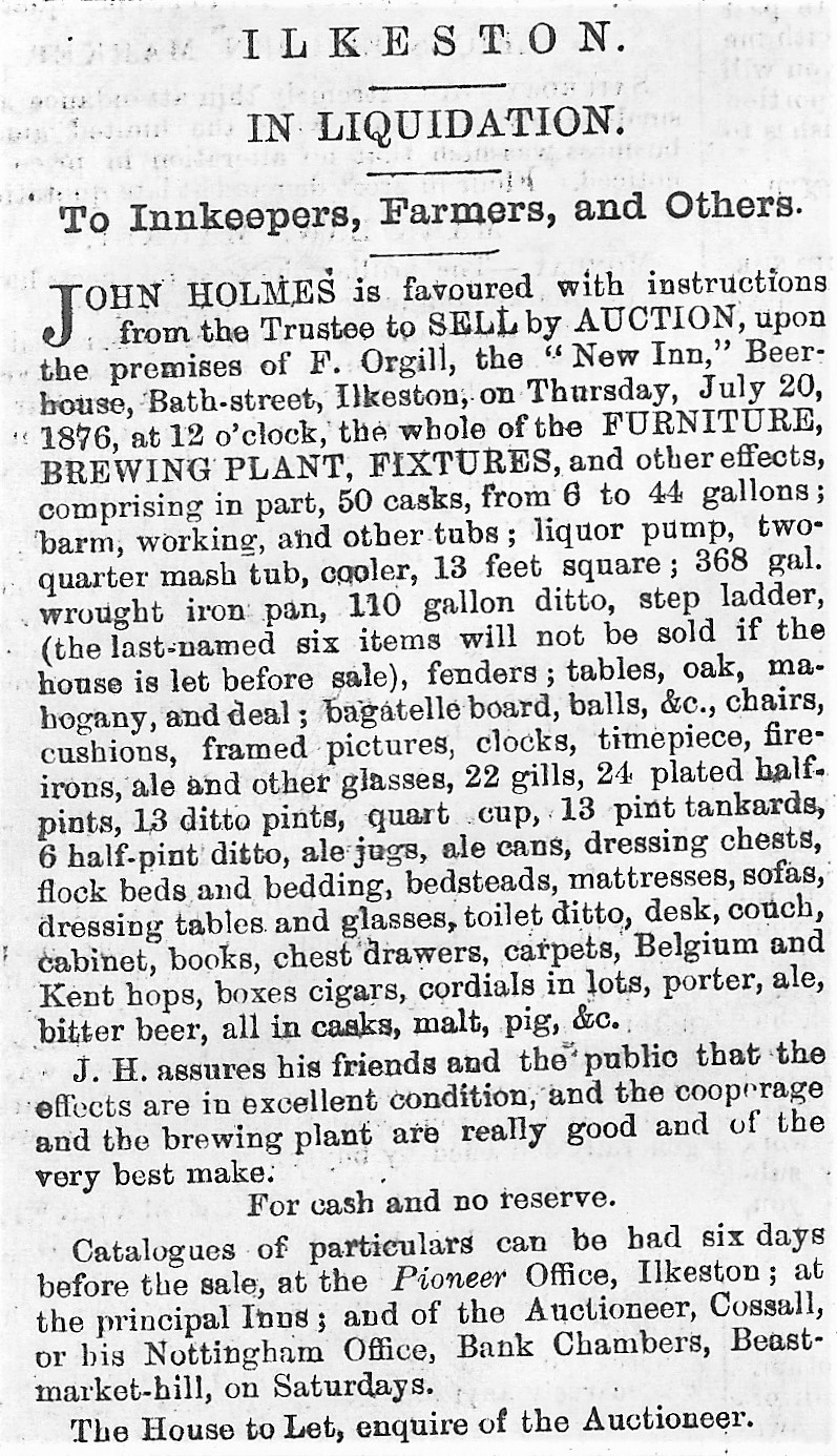 In September 1875 Francis Orgill’s licence was renewed although he had been convicted of keeping the inn open during prohibited hours. Shortly after this, it seems that he had had enough and was trying to sell all his cooperage, brewing and sales paraphernalia, as you can see on the right. And it didn’t take Francis long !!!