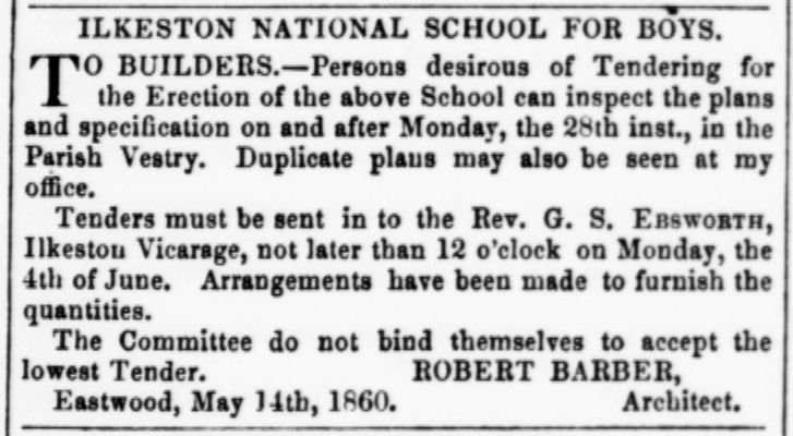 We are now in the mid-19th century and not to be outdone by the British School’s growth, the Anglicans now felt a need to expand their educational provision in the town. Plans for a new National School were drawn up by April 1850 (while John Ryder was the schoolmaster at the Butter Market School) and tenders to erect the building, together with a teacher’s residence, were sought. The architect had been chosen to be Robert Barber of Ivy Cottage in Eastwood, Nottinghamshire and Jedediah Wigley was then employed to build it.