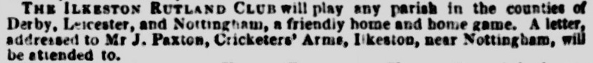 John Paxton was an extremely fast and deadly bowler for Rutland Cricket Club with a very pronounced local reputation but a very short ‘first-class cricket‘ career. It lasted for one match when John played for the North of England against the South, August 30th-31st 1848 at Leamington Spa. In his side’s one innings he opened the batting but was out for a duck, he took no wickets but did make two catches. And his side won by an impressive nine wickets. (see ESPNcricinfo for more details)