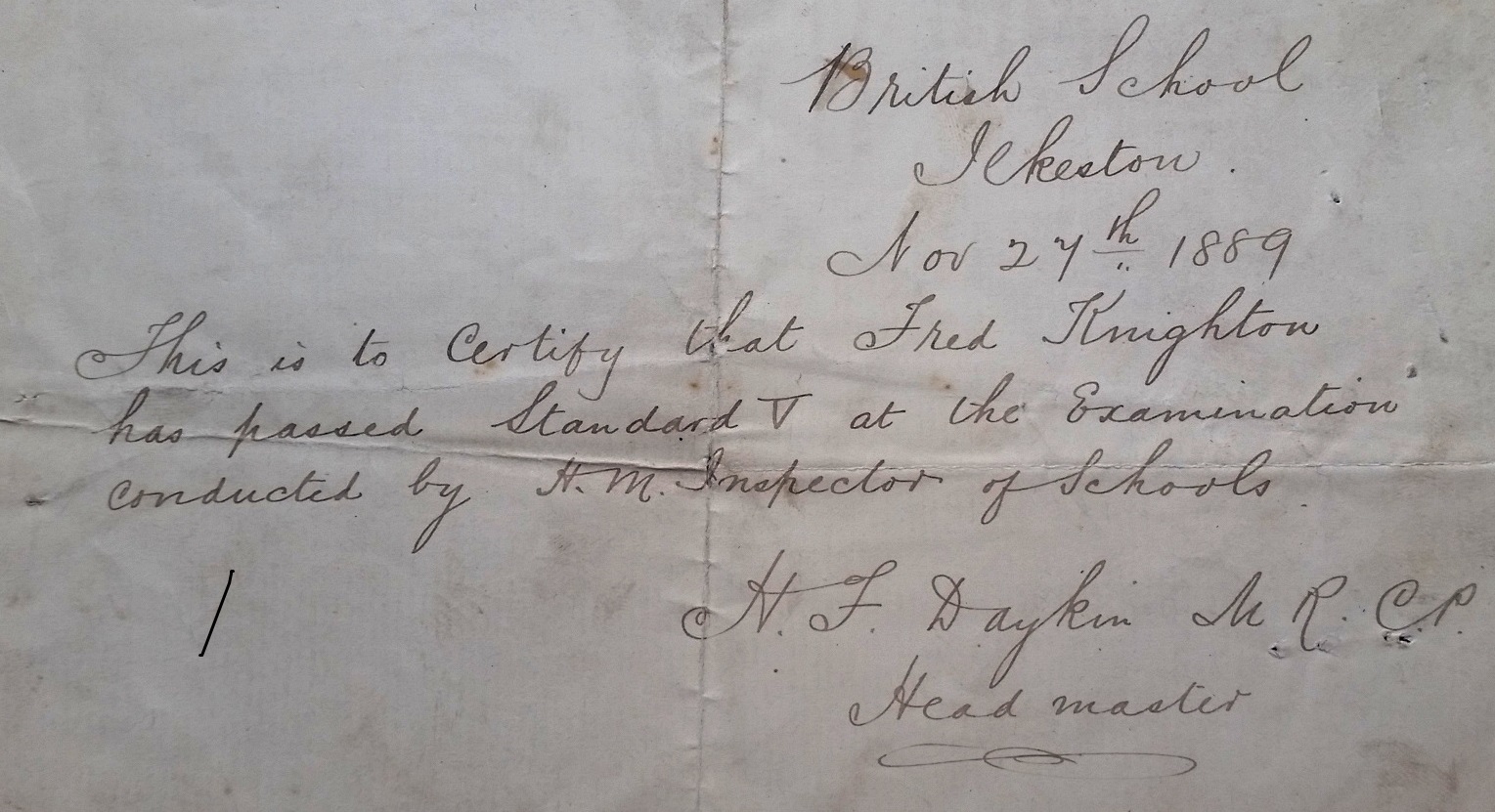 The two items are school leaving certificates for Fred Knighton (my great grandfather) and his brother, Harry Knighton. They both attended the British School on Bath Street, which used to stand opposite Albion Place, later the site of the Globe Picture House/billiard hall and latterly before demolition, John Collier’s and Gunn’s card shop. There is a distant view, showing the steps up into the school room in the view of the top end of Bath Street, looking down, in Cox and Mason’s Views of Ilkeston, published c.1900.