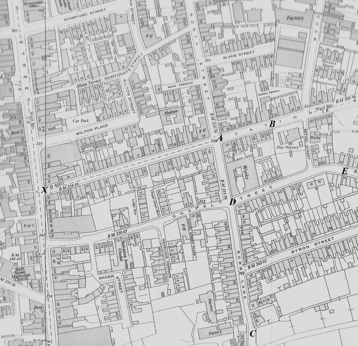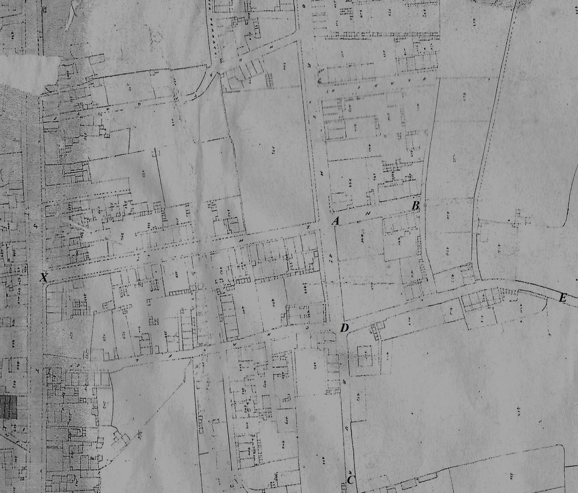 The first section of the street to be laid out was a very short cul-de-sac, about 40 yards in length, lying to the east of North Street, from A to B. In the late 1850’s this curious cul-de-sac was known as ‘Great East Street’.