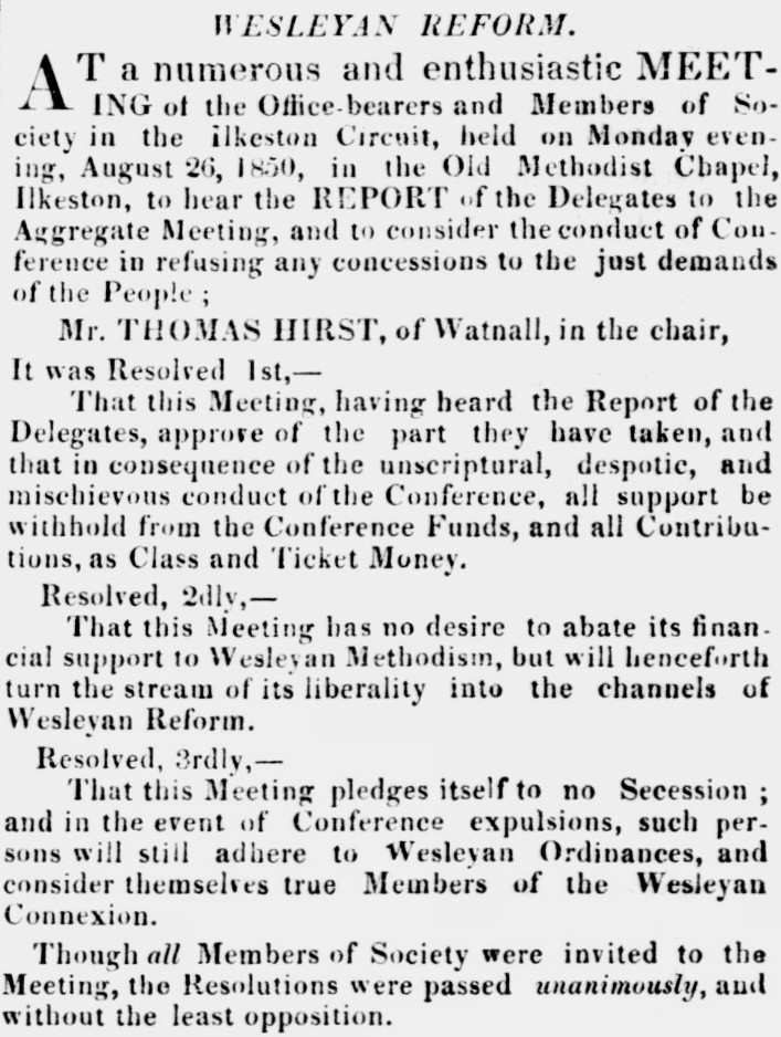 By 1850 such confrontations and treatment had caused the Ilkeston Circuit Wesleyan Methodists to lose three-quarters of its members to the Reform movement.