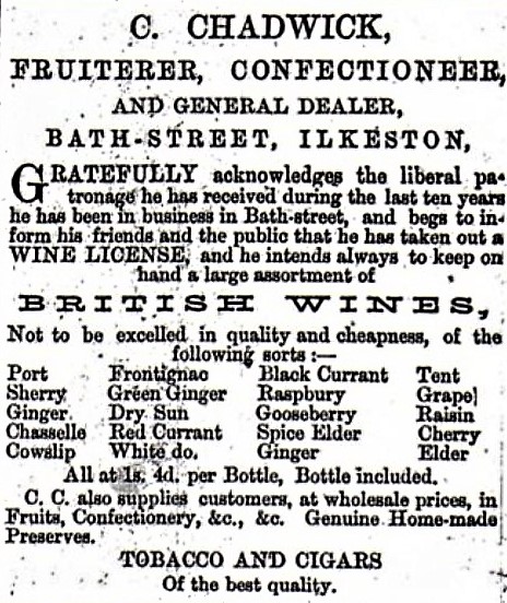 Charles Chadwick, fruiterer, greengrocer, potato merchant, confectioner and dealer in British wines, traded in Bath Street – in premises owned by next-door neighbour Elijah Higgett — until his death on December 7th, 1879.