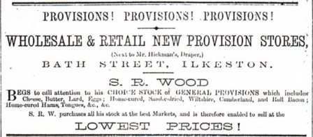 Stephen Richardson Wood, son of tailor Isaiah and Rachael (nee Richardson), opened a new provisions stores in Bath Street, next to John Norton Hickman’s shop, in January 1862. He had a store in Nottingham too.