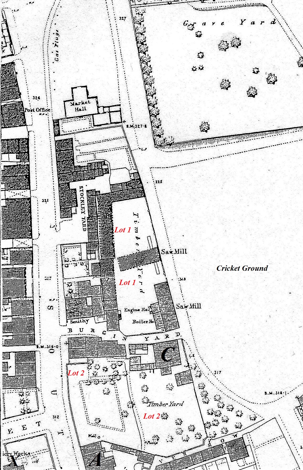 Lot 1 was an extensive copyhold builder’s yard with saw mills, now used as a saw yard and timber yard, with an engine house, boiler house, workshops, sheds and other outbuildings, all north of Burgin Yard. All the fixed machinery was included and its total area was just over a third of an acre,