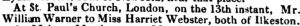 Looking for a marriage between William Warner and Harriett Webster, either before or after 1861 is fruitless, I have so far found !! There is no official/semi-official/ parochial record of such a marriage. There is however a mention of their marriage in a couple of Nottingham newspapers of April 1852; here is one …