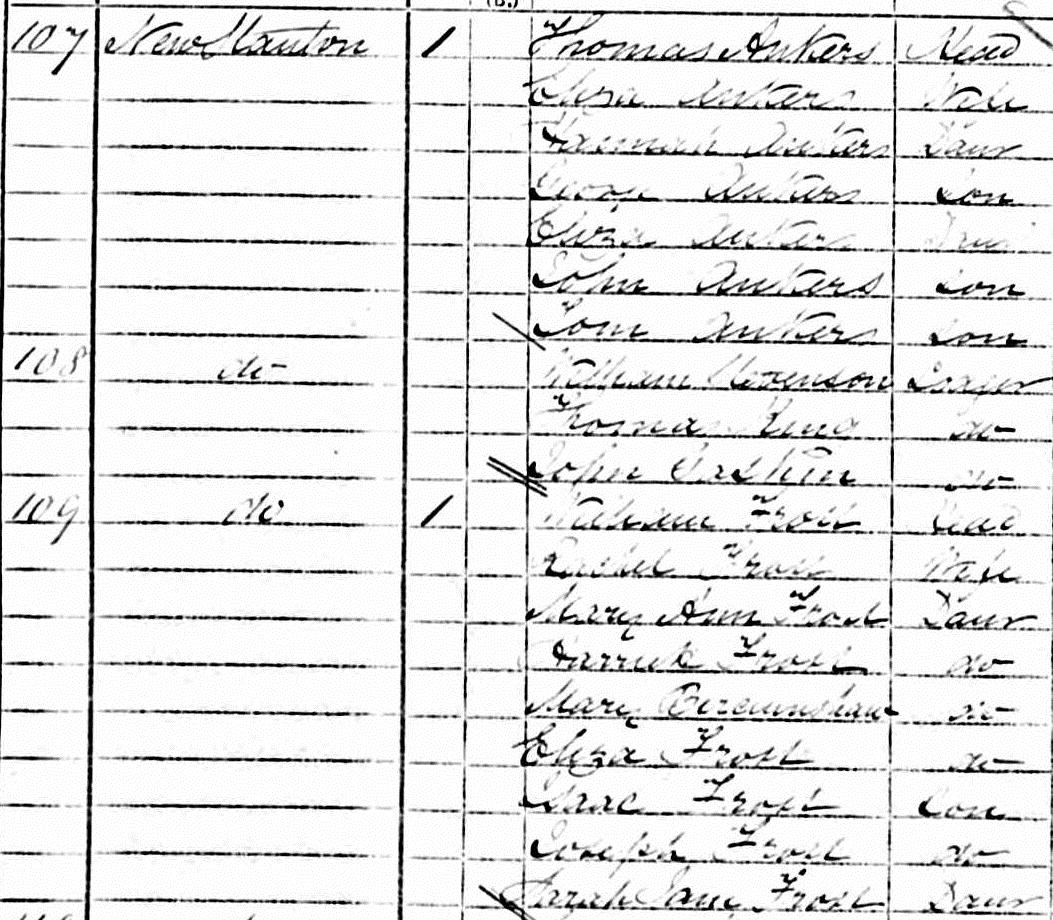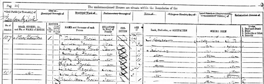 As can be seen on the example shown here, the enumerator has given 3 schedule numbers (107 to 109) to what looks appears to be three families, but I was wrong to accept this in the way I’ve written it above, for if one looks closer at the entry for schedule number 108, one can see that they are in fact lodgers in the household of the Ankers family (listed as 107) above them.