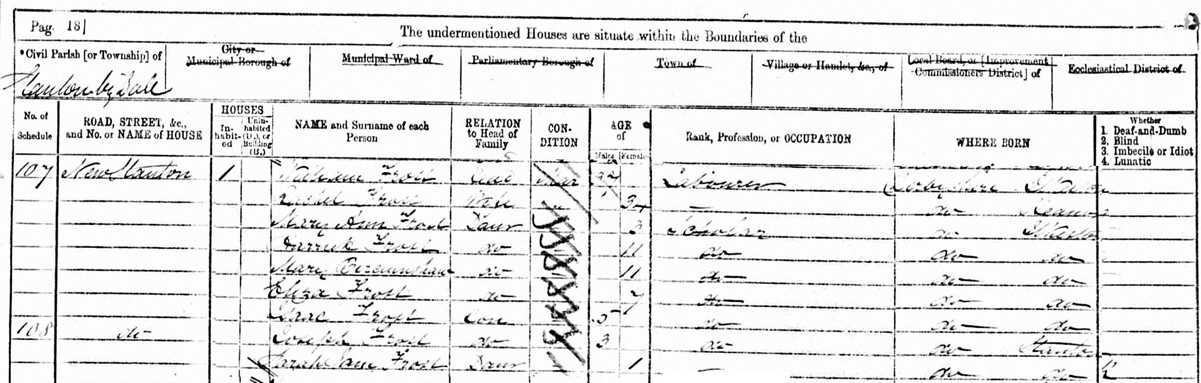 Looking on the aforementioned census, we see that the Frost’s are given the schedule number of 109, with schedule numbers 101 to 117 belonging to the row of houses they lived in.