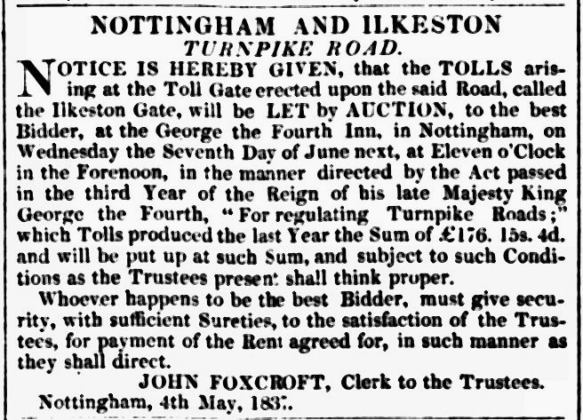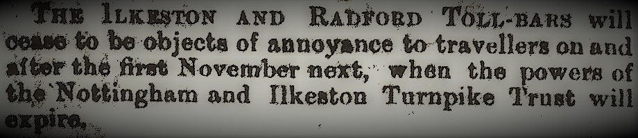 “Ilkeston Toll-Bar is no more! The Turnpike Trust expired on Saturday night last and on Sunday morning scarcely a stick of the bar was to be seen – gates, and all the chief posts, having taken a moonlight flight”.