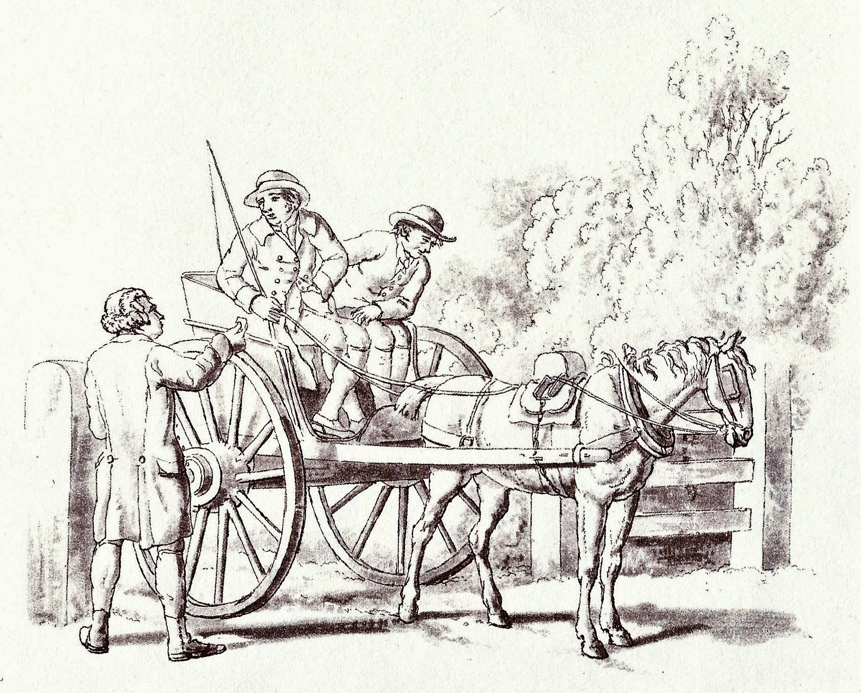 Here comes Squire Mundy’s coach, one of the heavy, clumsy, springless coaches of the time, which even on the turnpike nearly jolt the occupants to pieces, and on the village roads are a veritable torture. It pays 3d.