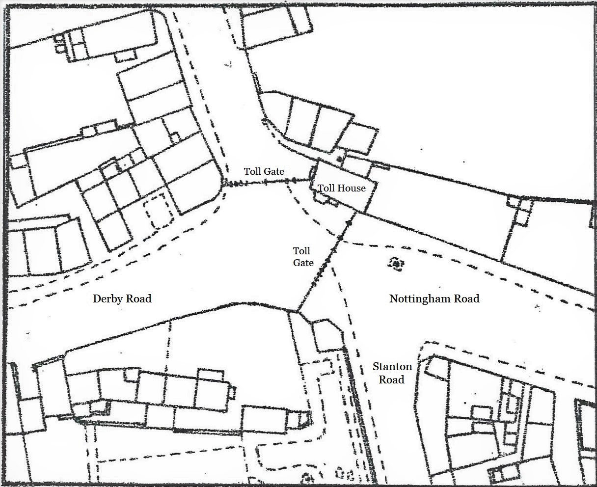 “The toll house was on the East side and between the two gates. Mr. William Campbell had charge of the toll bar for many years. When Belper Street was opened a chain was put across Derby Road just below the present Albert Street, and Mr. Campbell had to unlock it when vehicles came Belper Street way. He was a tailor and plied his business at home”.