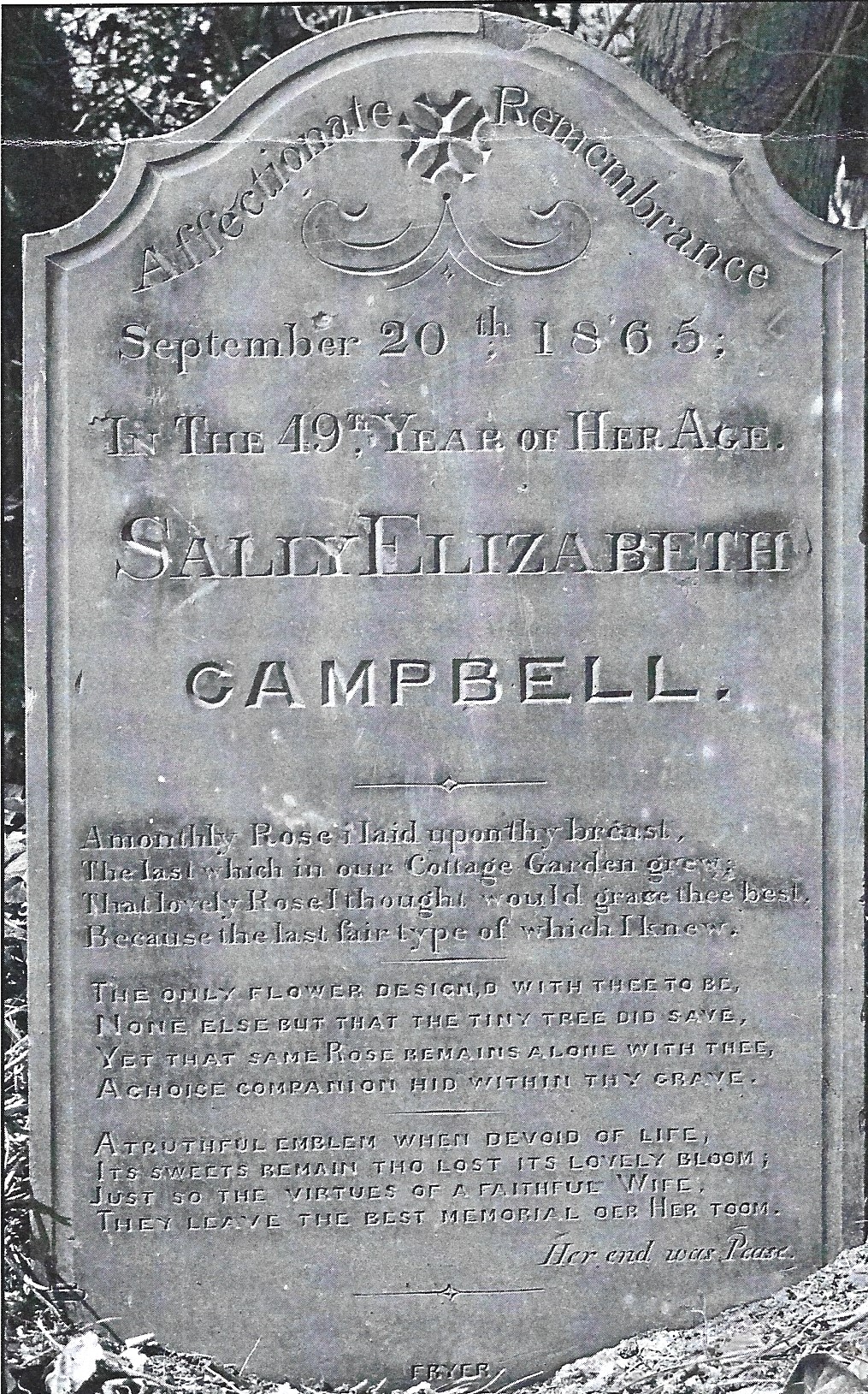 Sally Elizabeth Campbell died on September 20th, 1865 and was buried in St. Mary’s church graveyard extension. Most likely the verses of poetry on her stone were composed by her husband.
