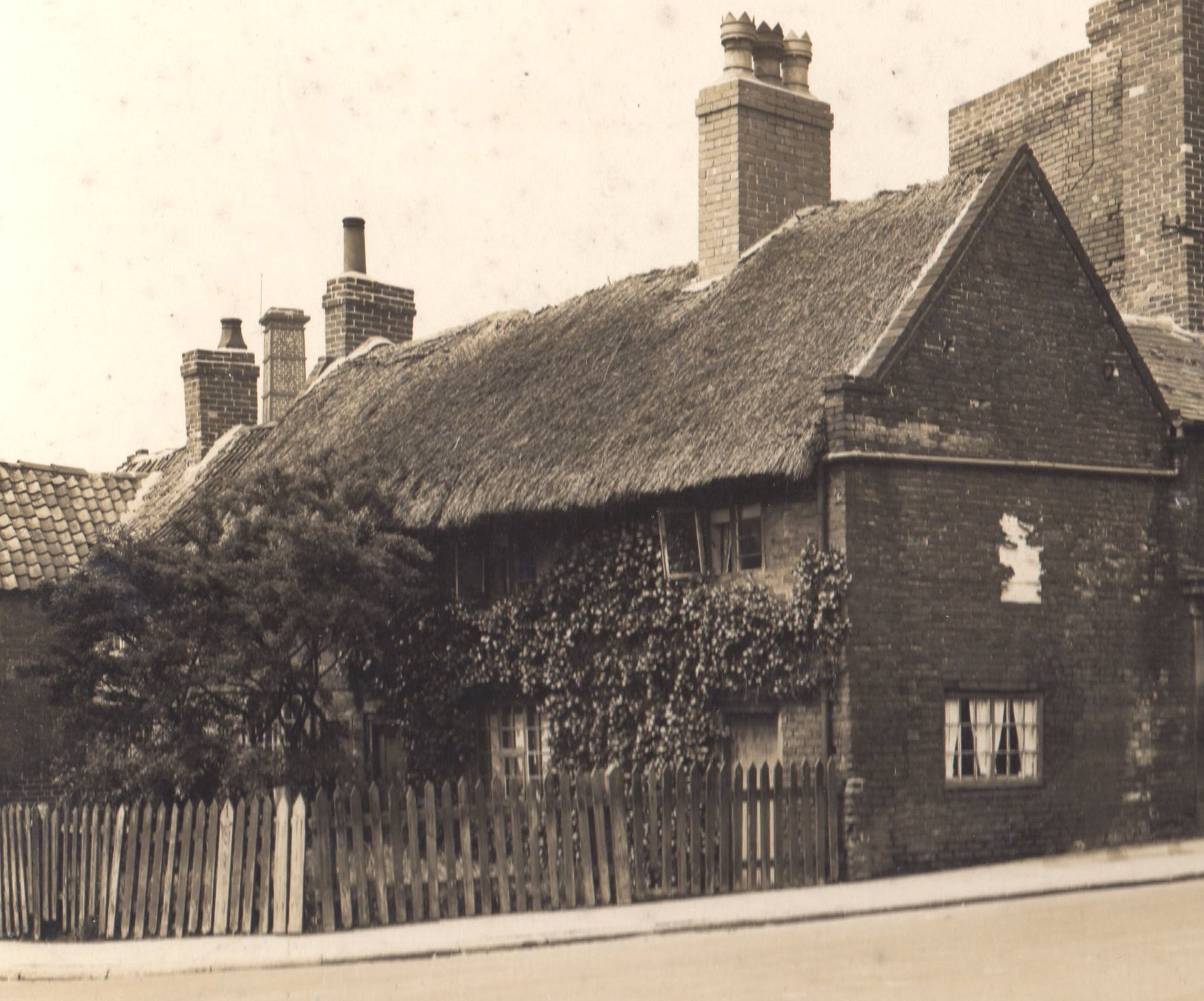 Thatched cottages at the corner of South Street (to the right) and Derby Road (to the left), about 1933. (courtesy of Ilkeston Reference Library).