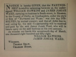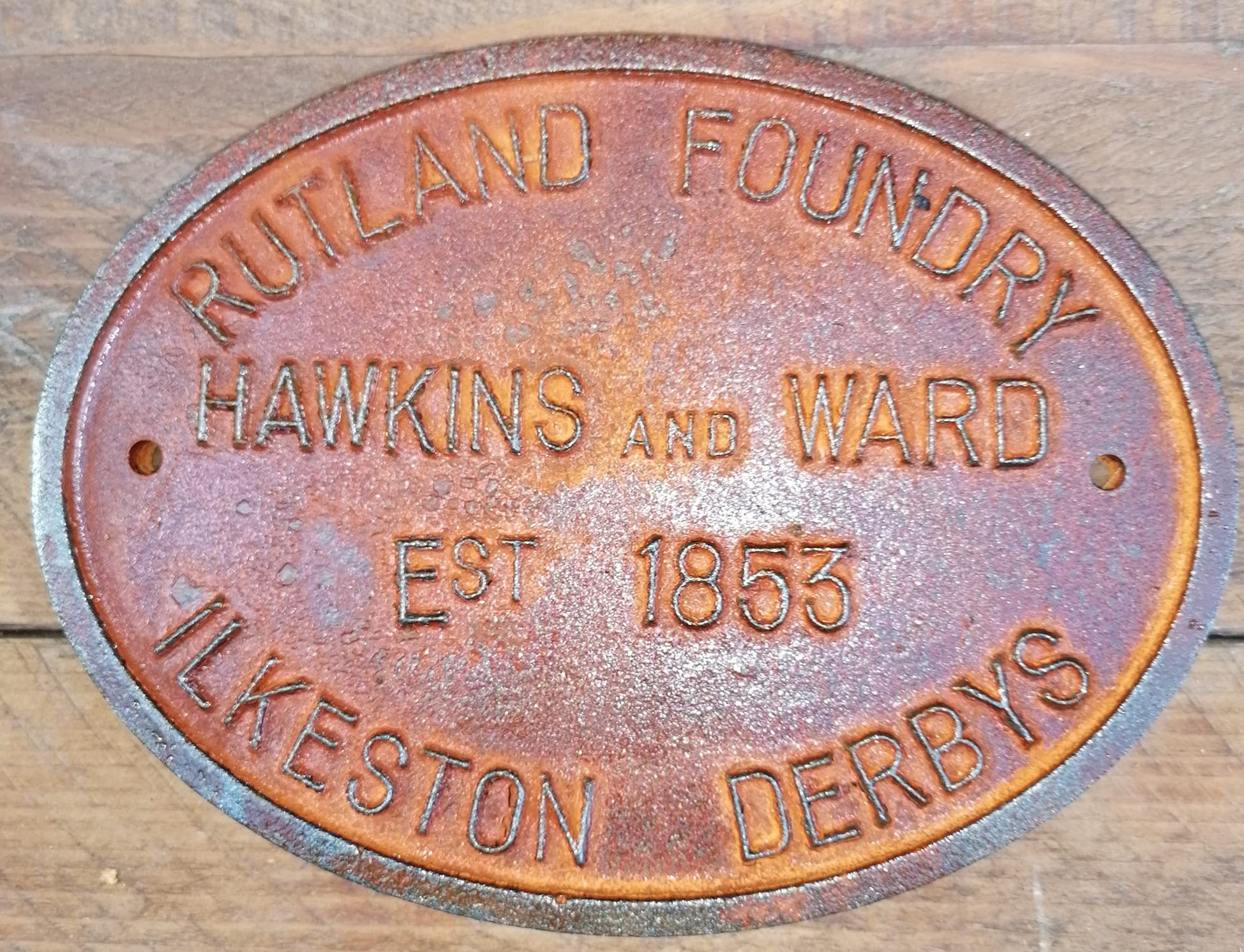 The letterhead of William’s business correspondence indicates that his firm was established in 1853 as does the cast iron plate (above left). It is evidence of a relative short-lived partnership between William Hawkins and James Josiah Ward. Very shortly after, in 1854 they moved into the Rutland Foundry premises at the (then) bottom of Queen Street. The partnership was terminated on March 17th 1858. When living in Mundy Street with his family, James Ward died in June 1861. William Hawkins, of course, then became a very prosperous Ilkeston ironfounder.