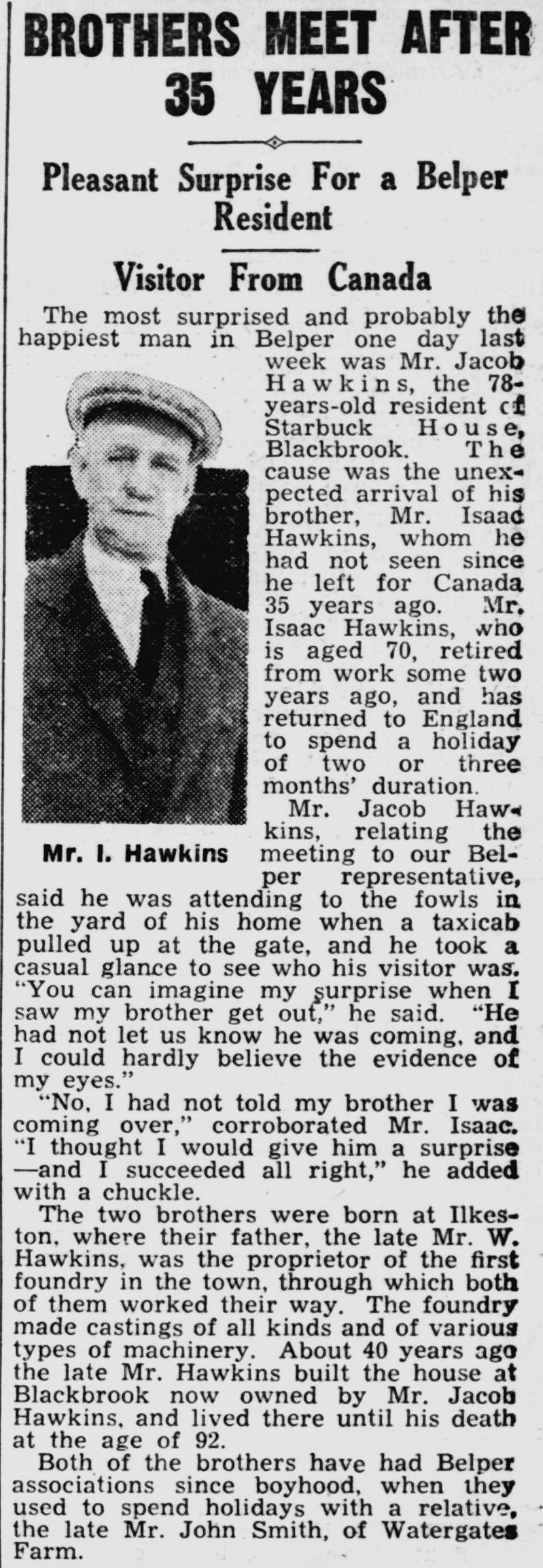 The most surprised and probably the happiest man in Belper one day last week was Mr Jacob Hawkins, the 78-years-old resident of Starbuck House, Blackbrook. The cause was the unexpected arrival of his brother, Mr Isaac Hawkins, whom he had not seen since he left for Canada, 35 years ago. Mr Isaac Hawkins, who is aged 70, retired from work some two years ago, and has returned to England to spend a holiday of two or three months’ duration.